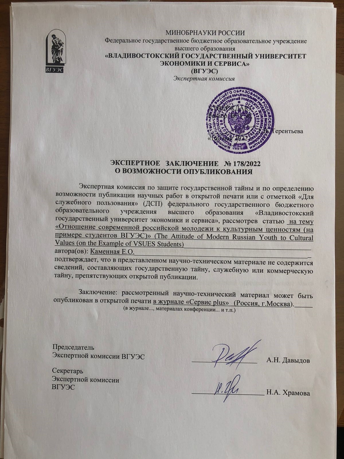 The attitude of modern russian youth to cultural values (on the example of VSUES (vladivostok state university of economics and service) students)