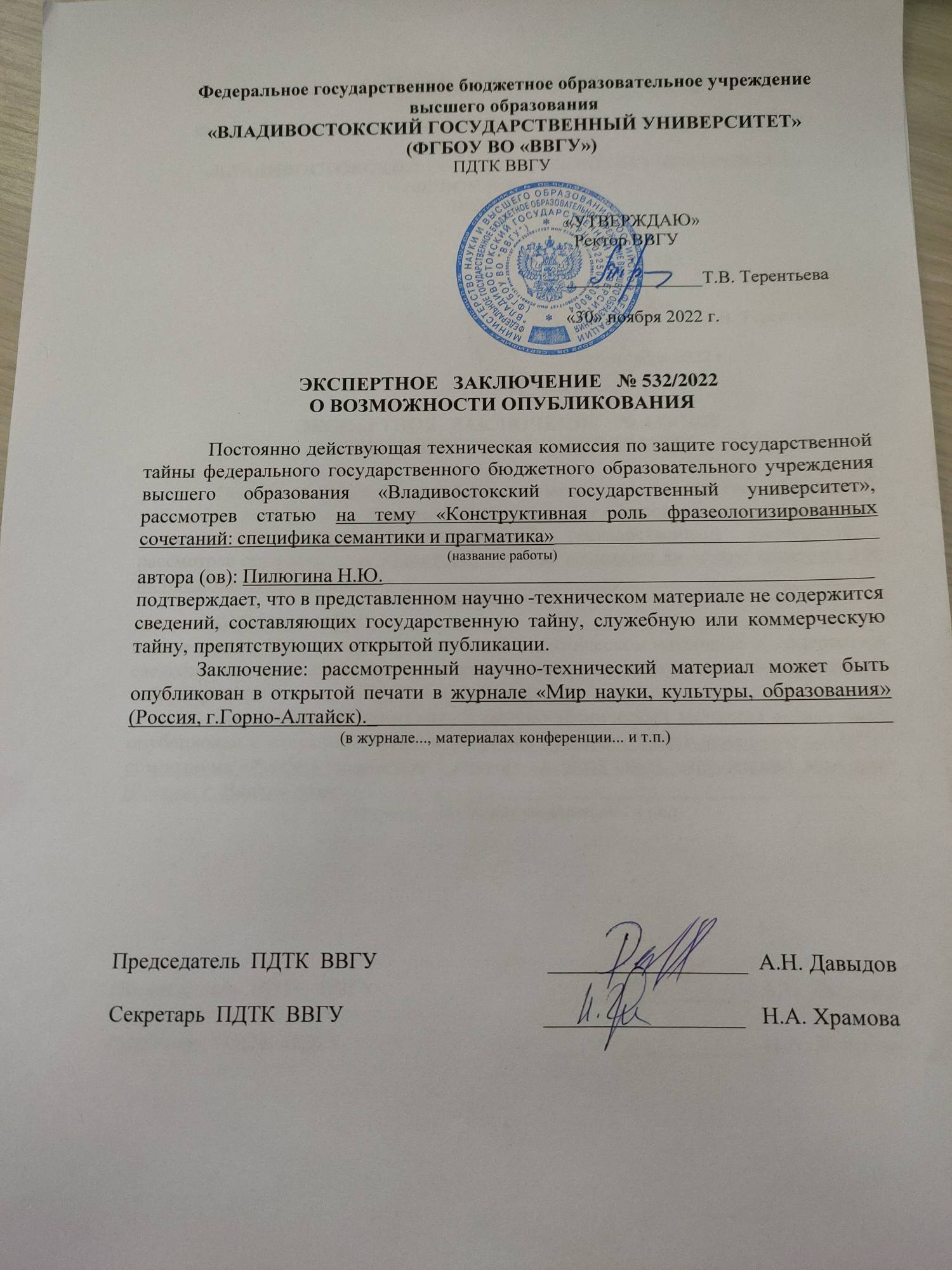 Конструктивная роль фразеологизированных сочетаний: специфика семантики и прагматика
