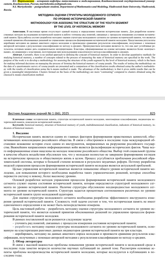 Методика оценки структуры молодежного сегмента по уровню исторической памяти
