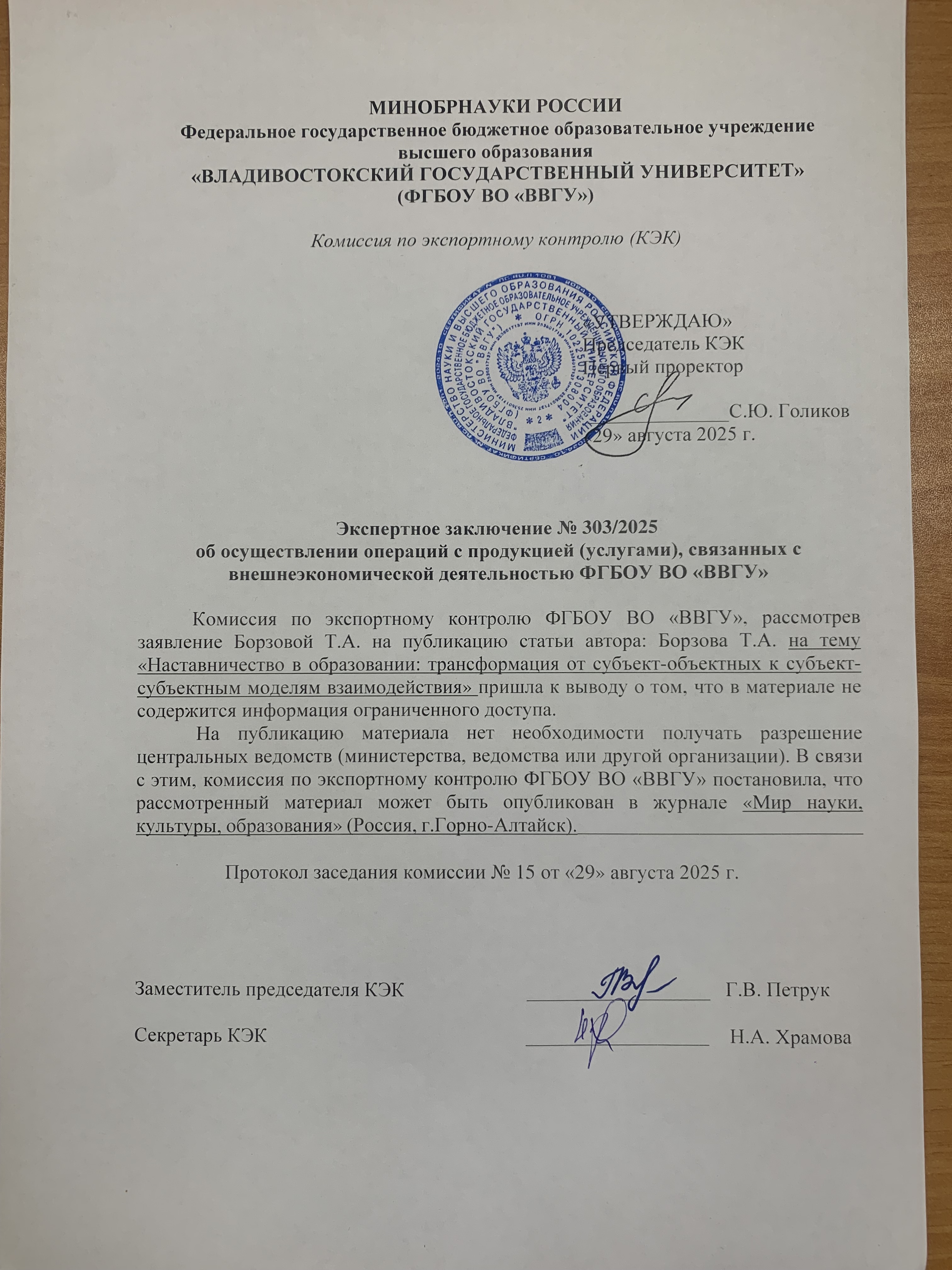 НАСТАВНИЧЕСТВО В ОБРАЗОВАНИИ: ТРАНСФОРМАЦИЯ ОТ СУБЪЕКТ-ОБЪЕКТНЫХ К СУБЪЕКТ-СУБЪЕКТНЫМ МОДЕЛЯМ ВЗАИМОДЕЙСТВИЯ