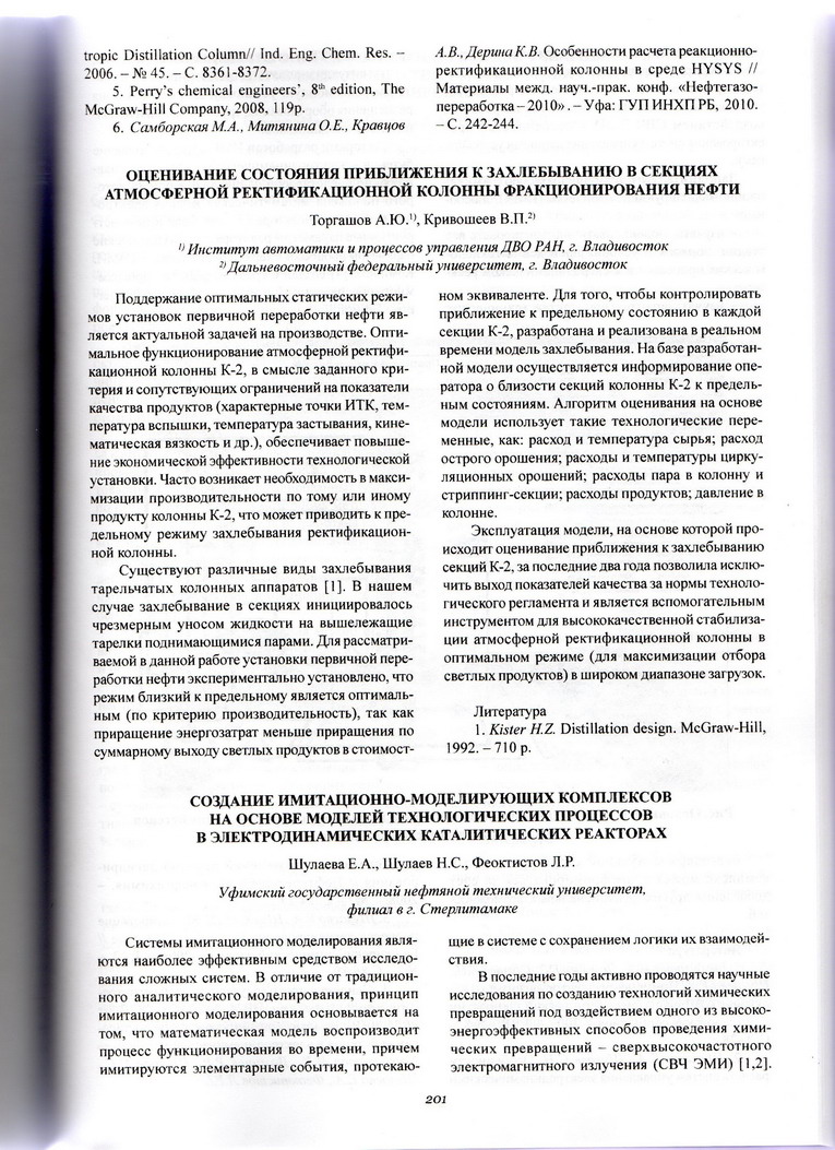 Оценивание состояния приближения к захлёбыванию в секциях атмосферной ректификационной колонны фракционирования нефти