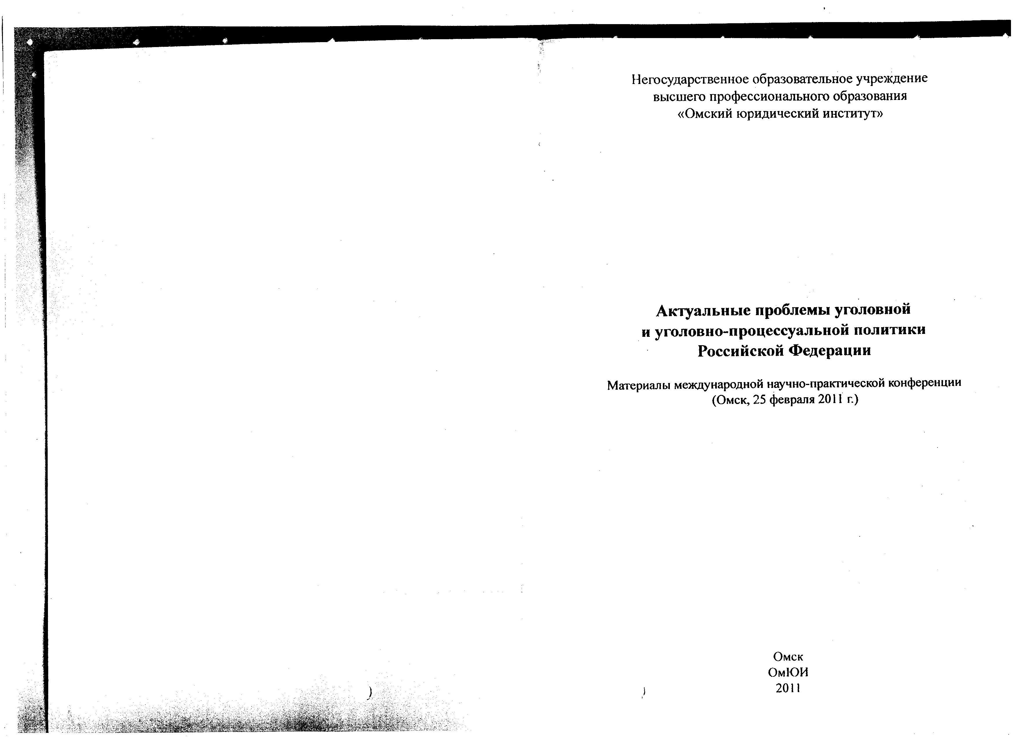 Актуальные проблемы уголовной и уголовно-процессуальной политики Российской Федерации: материалы международной научно-практической конференции (Омск, 25 февраля 2011 г.)/отв.ред. Ю.В. Деришев.-Омск: Омский юридический институт, 2011.-300 с.