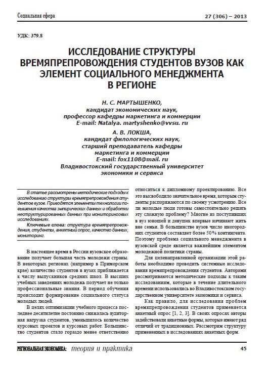 Исследование структуры времяпрепровождения студентов вузов как элемент социального менеджмента в регионе