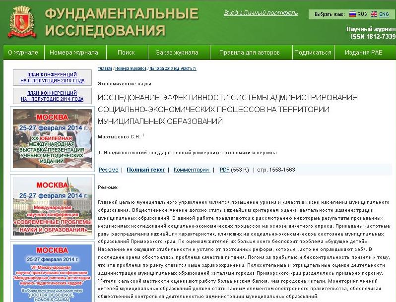 Исследование эффективности системы администрирования социально-экономических процессов на территории муниципальных образований