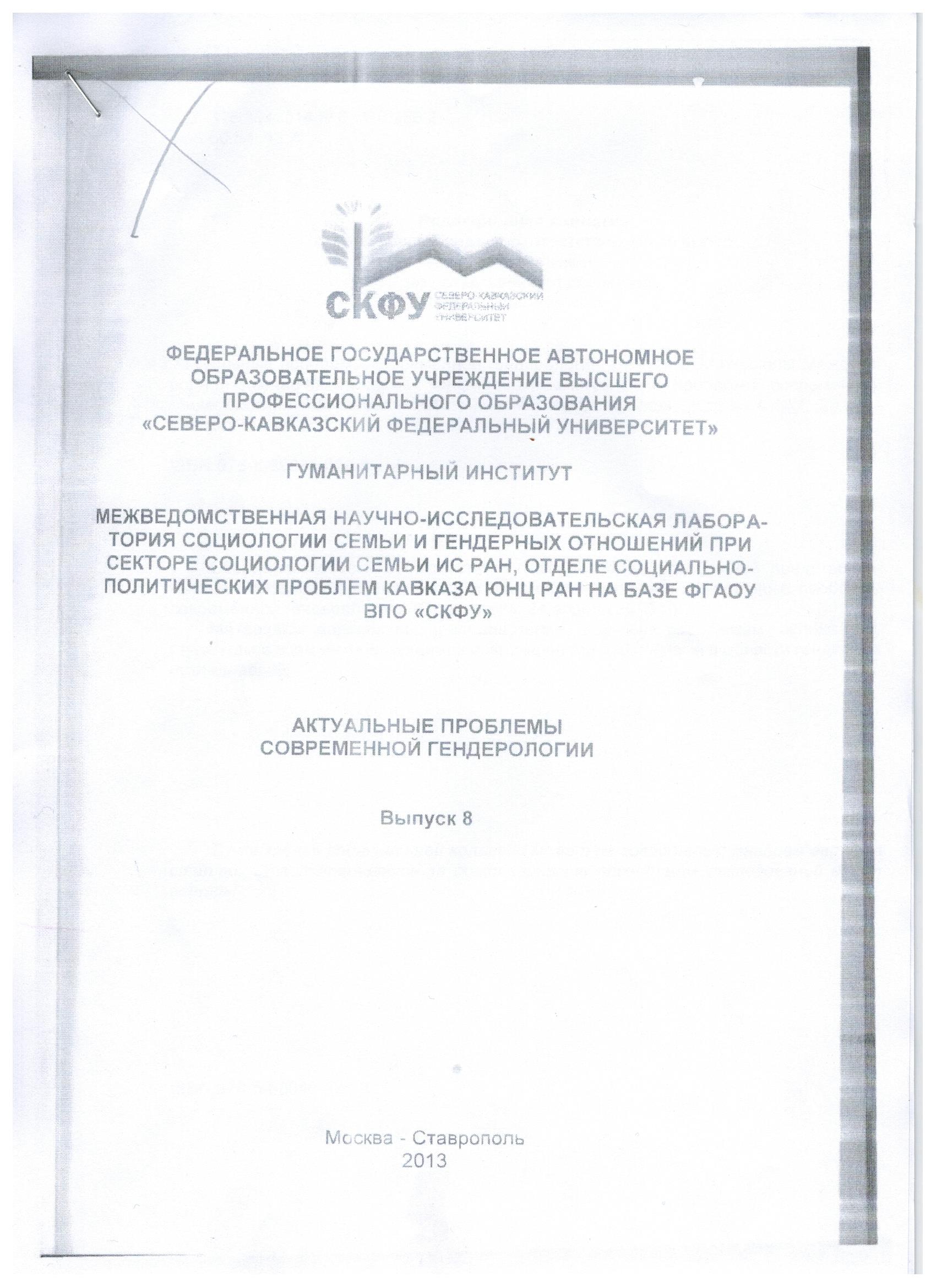 Межведомственная научно-исследовательская лаборатория социологии семьи и гендерных отношений при секторе социологии семьи ИС РАН , отделе социально-политических проблем Кавказа ЮНЦ РАН на базе ФГАОУ ВПО "СКФУ"