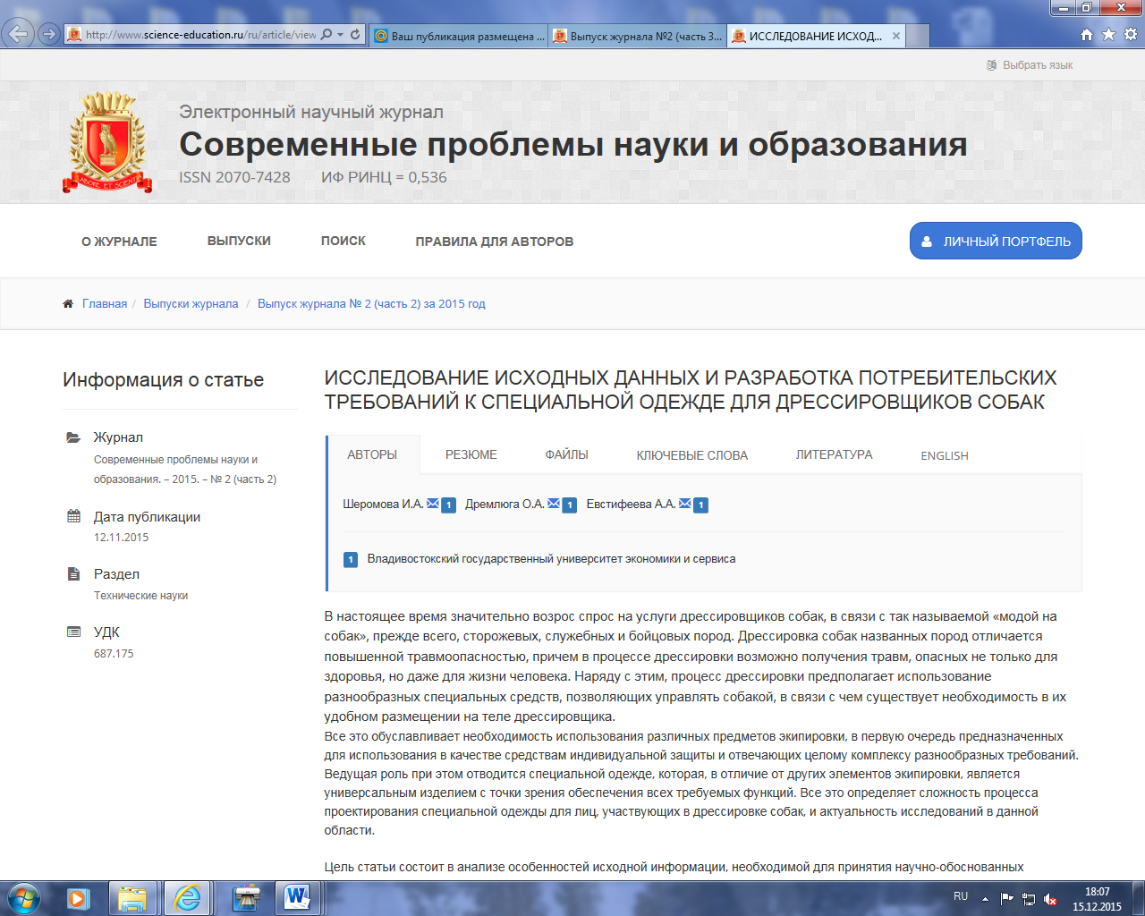 ИССЛЕДОВАНИЕ ИСХОДНЫХ ДАННЫХ И РАЗРАБОТКА ПОТРЕБИТЕЛЬСКИХ ТРЕБОВАНИЙ К СПЕЦИАЛЬНОЙ ОДЕЖДЕ ДЛЯ ДРЕССИРОВЩИКОВ СОБАК