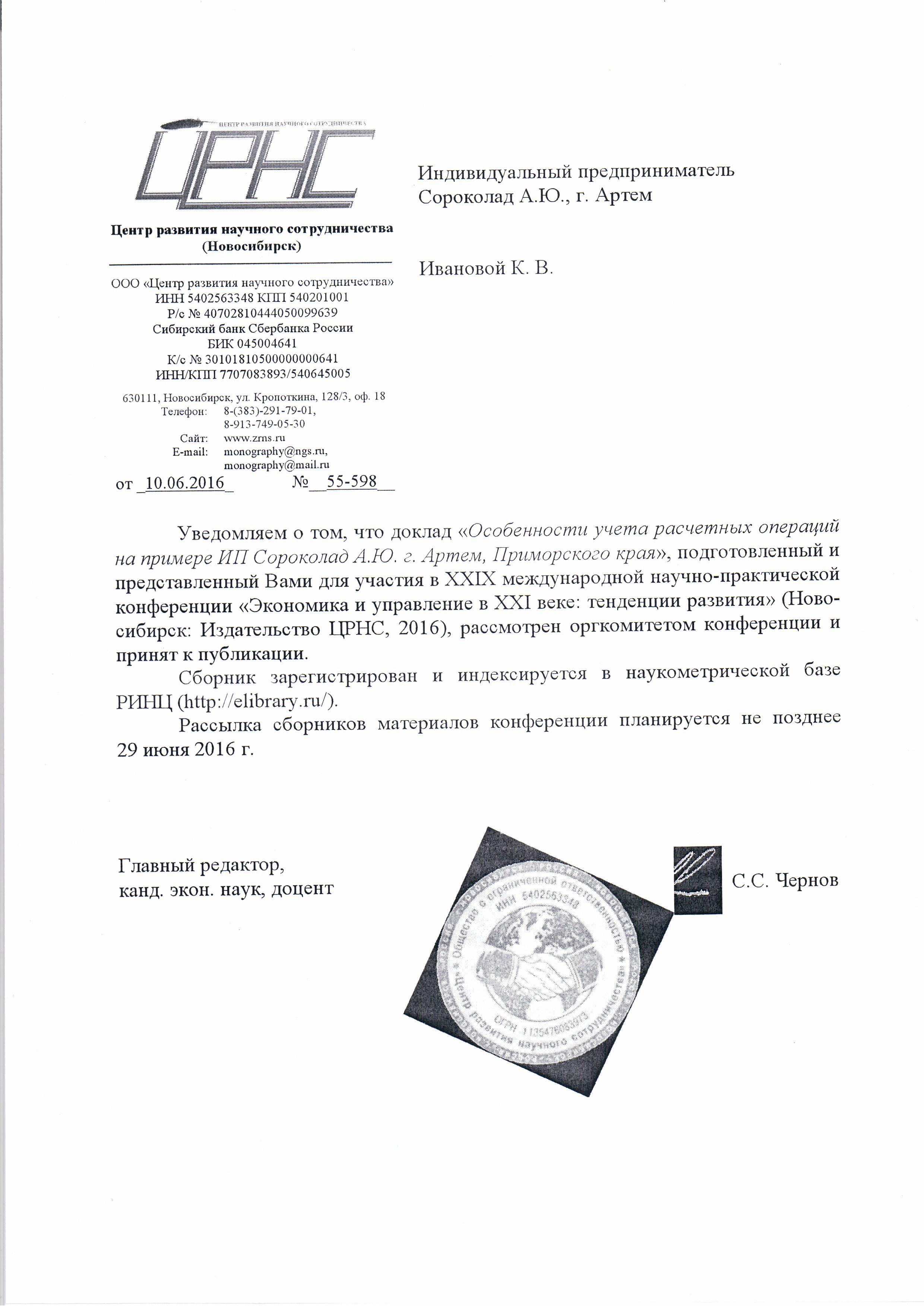 Особенности учета расчетных операций на примере ИП Сороколад А.Ю., г. Артем, Приморского края