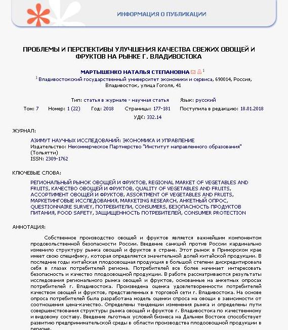 Проблемы и перспективы улучшения качества свежих овощей и фруктов на рынке г. Владивостока