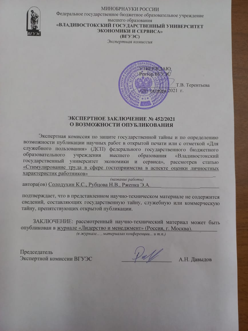 Стимулирование труда в сфере гостеприимства в аспекте оценки личностных характеристик работников