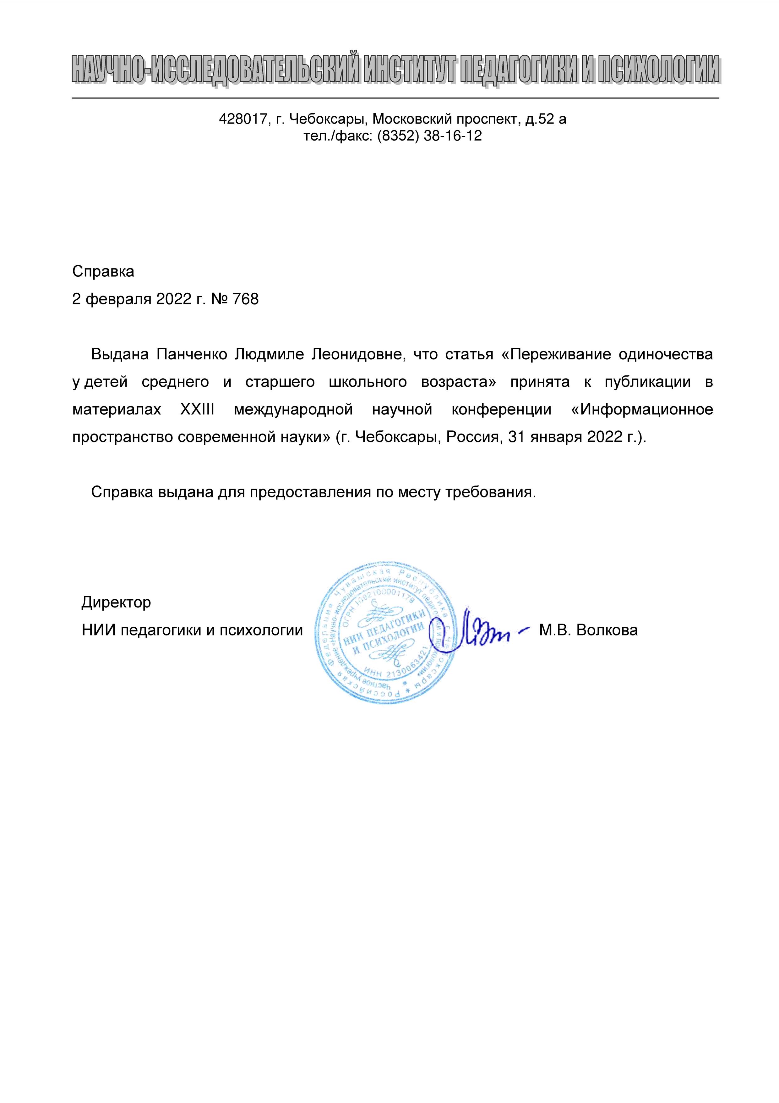 ПЕРЕЖИВАНИЕ ОДИНОЧЕСТВА У ДЕТЕЙ СРЕДНЕГО И СТАРШЕГО ШКОЛЬНОГО ВОЗРАСТА