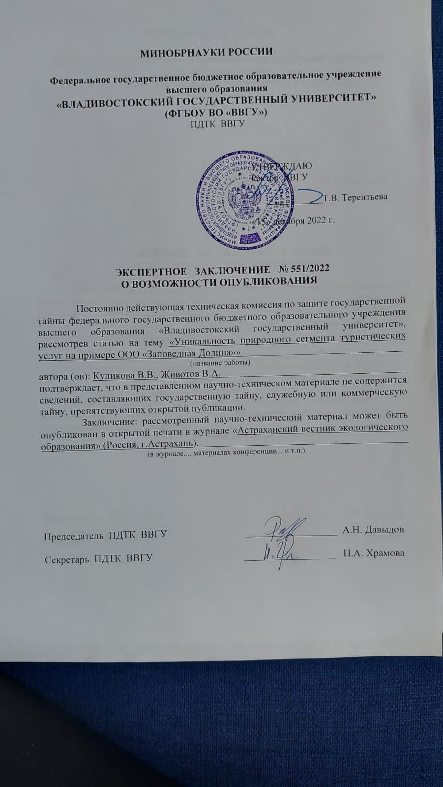 УНИКАЛЬНОСТЬ ПРИРОДНОГО СЕГМЕНТА ТУРИСТИЧЕСКИХ УСЛУГ НА ПРИМЕРЕ ООО «ЗАПОВЕДНАЯ ДОЛИНА»