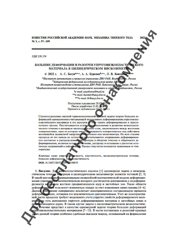 БОЛЬШИЕ ДЕФОРМАЦИИ И РАЗОГРЕВ УПРУГОВЯЗКОПЛАСТИЧЕСКОГО МАТЕРИАЛА В ЦИЛИНДРИЧЕСКОМ ВИСКОЗИМЕТРЕ