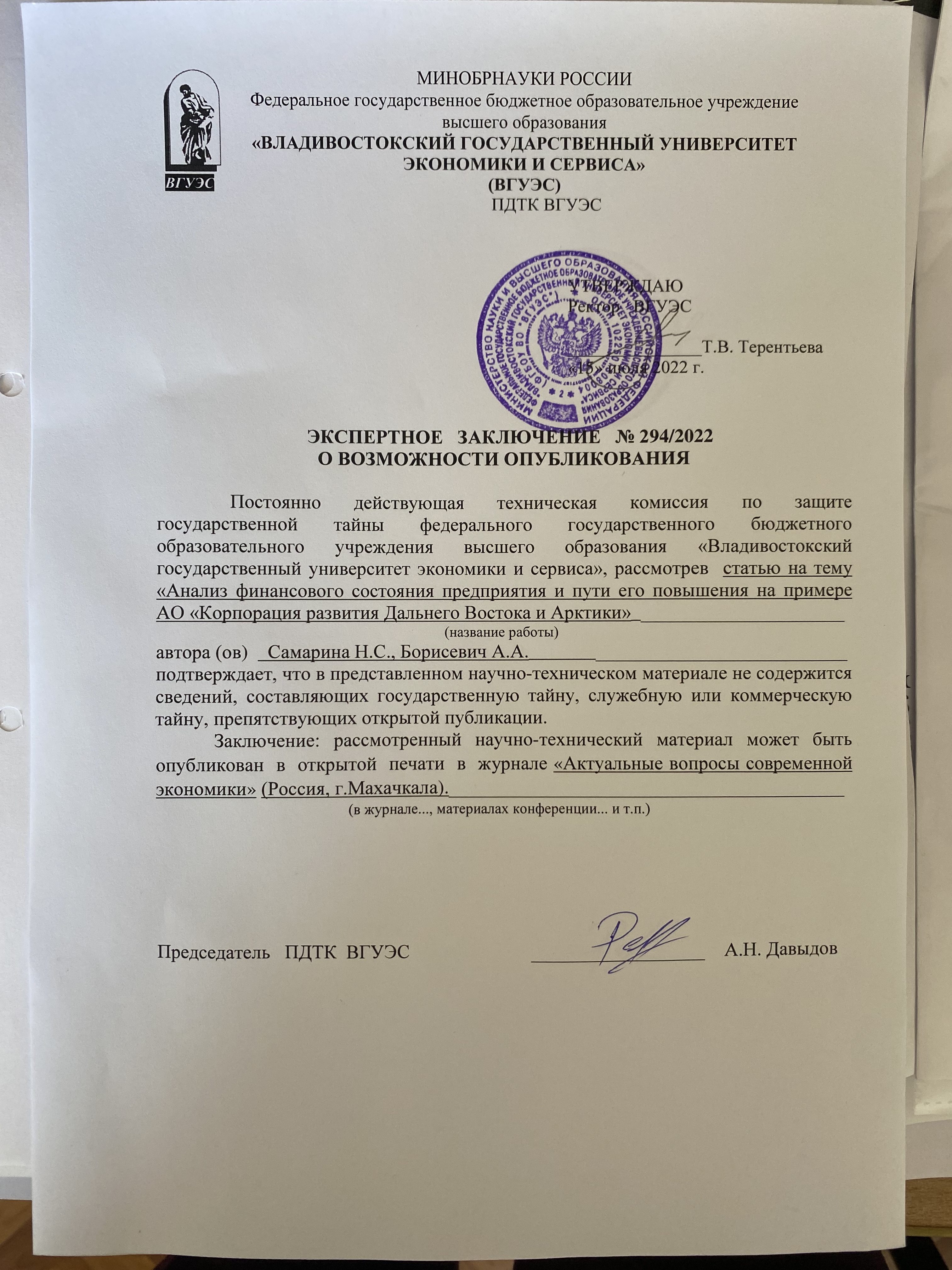 АНАЛИЗ ФИНАНСОВОГО СОСТОЯНИЯ ПРЕДПРИЯТИЯ И ПУТИ ЕГО ПОВЫШЕНИЯ НА ПРИМЕРЕ АО «КОРПОРАЦИЯ РАЗВИТИЯ ДАЛЬНЕГО ВОСТОКА И АРКТИКИ»