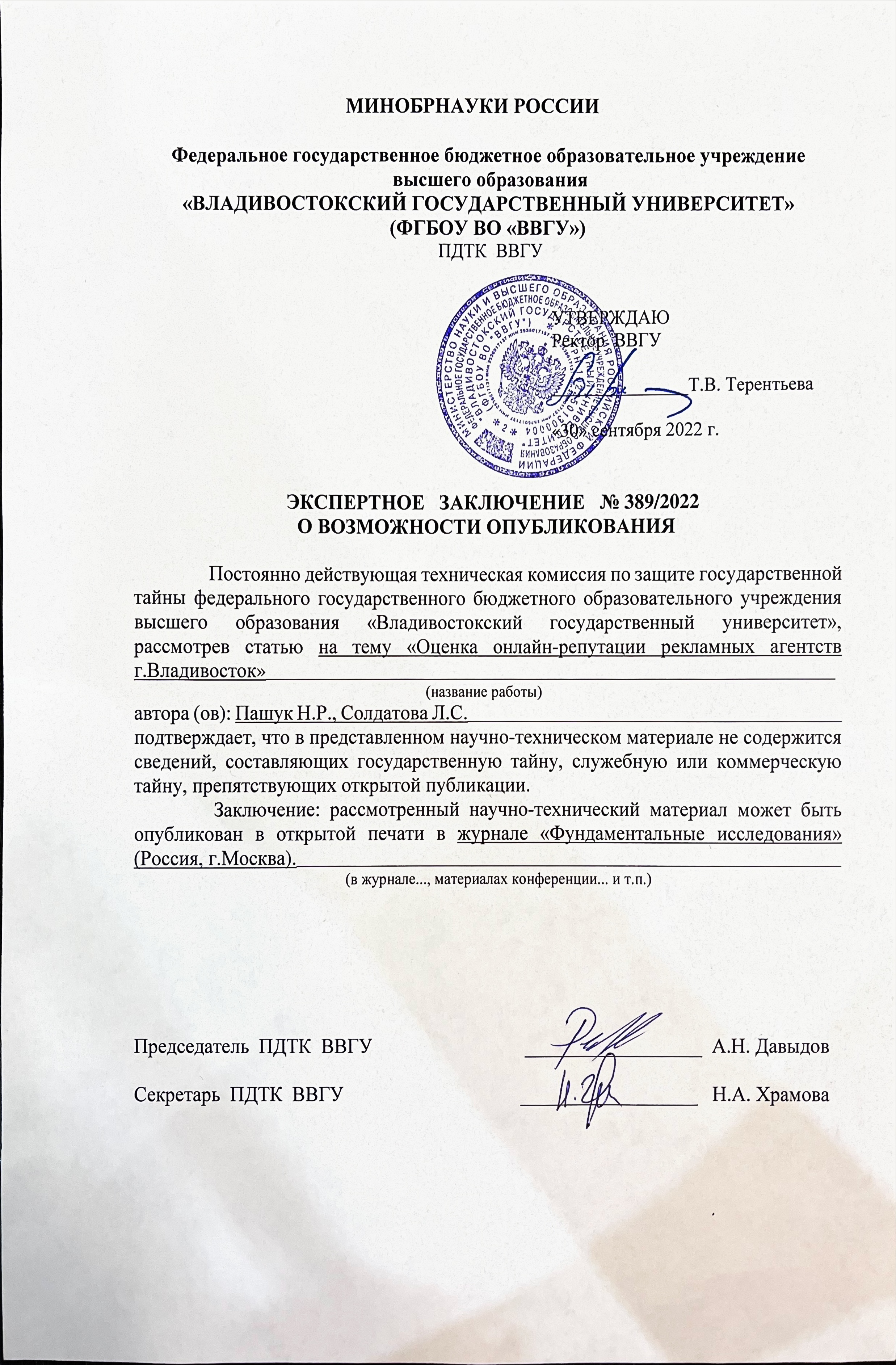 ОЦЕНКА ОНЛАЙН-РЕПУТАЦИИ РЕКЛАМНЫХ АГЕНТСТВ Г. ВЛАДИВОСТОК