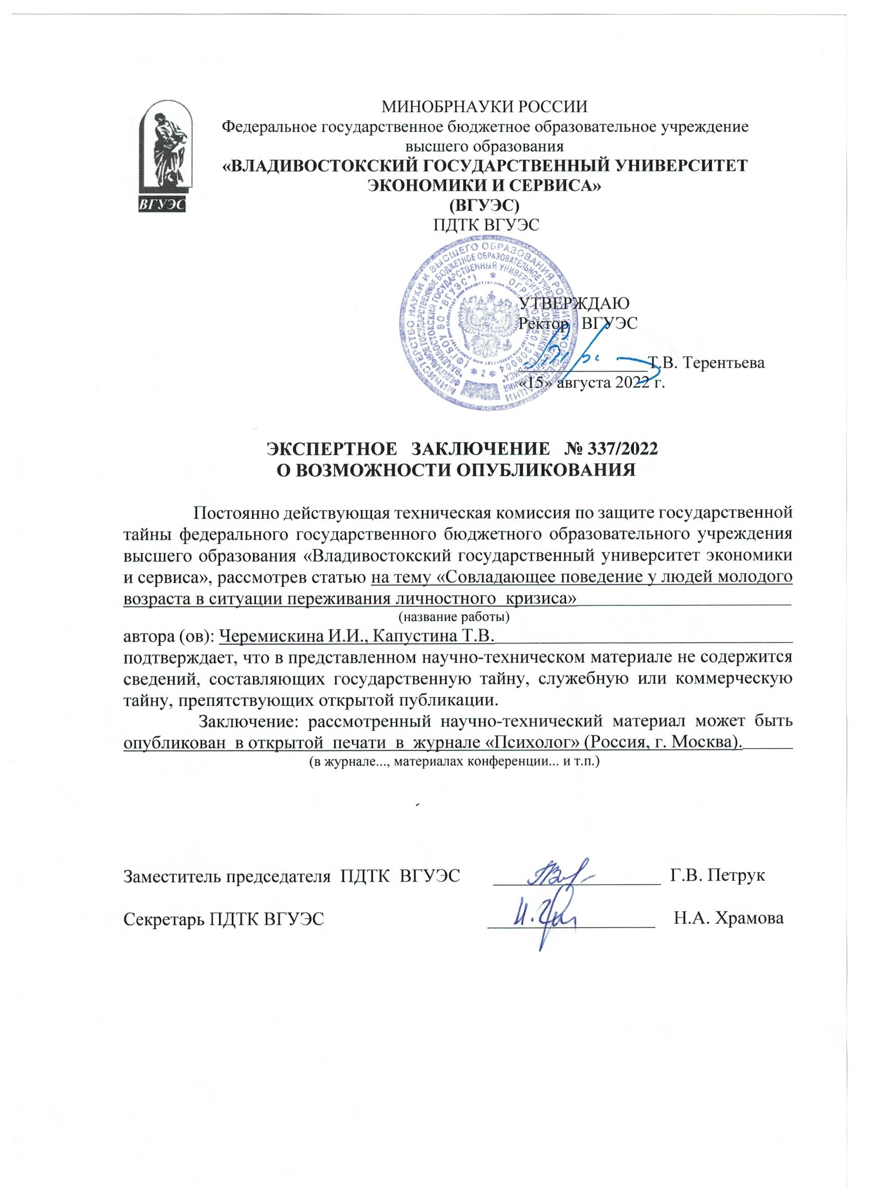 Совладающее поведение у молодых людей в состоянии переживаня личностного кризиса
