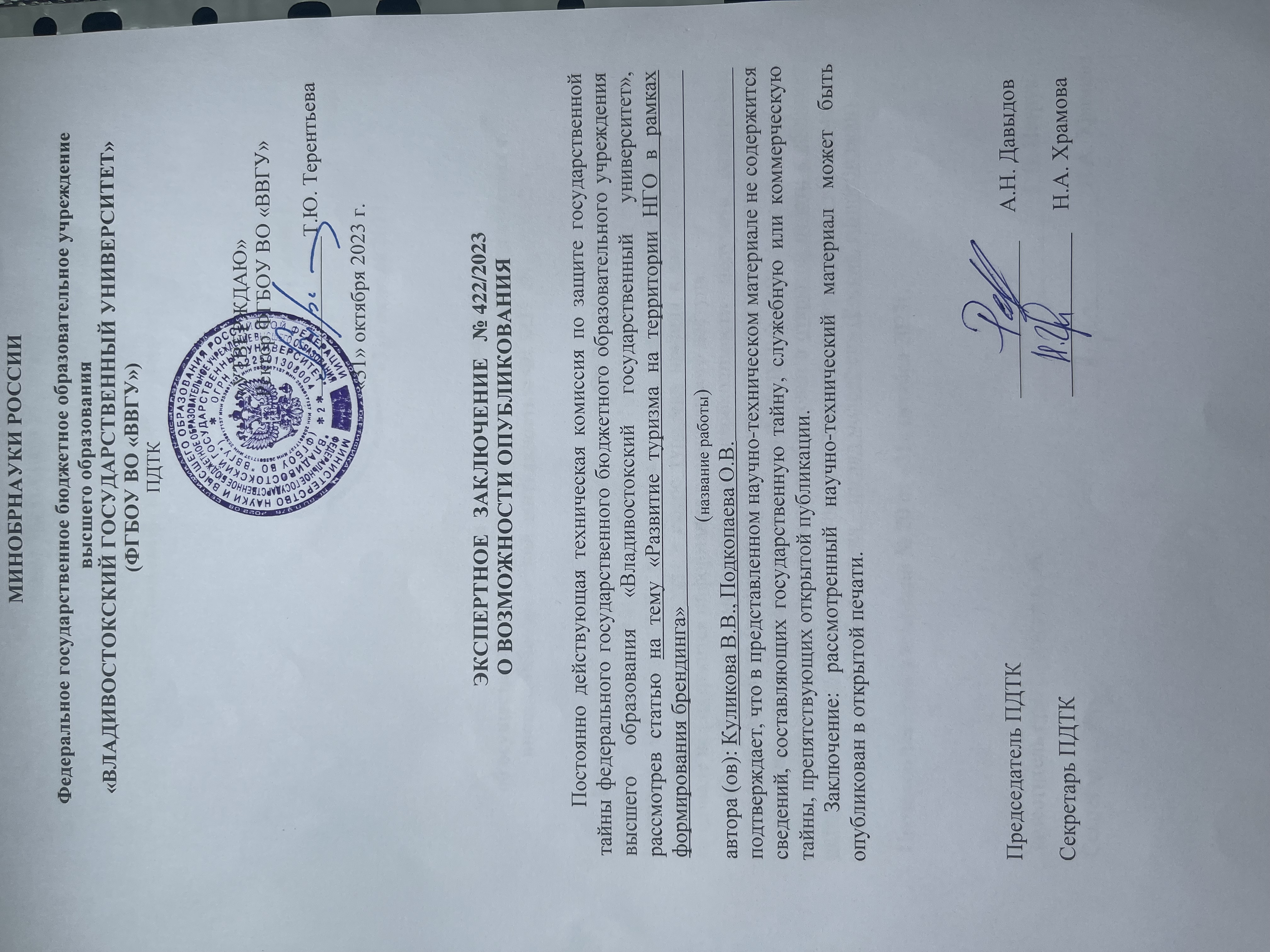 РАЗВИТИЕ ТУРИЗМА НА ТЕРРИТОРИИ НАХОДКИНСКОГО ГОРОДСКОГО ОКРУГА В РАМКАХ ФОРМИРОВАНИЯ БРЕНДИНГА