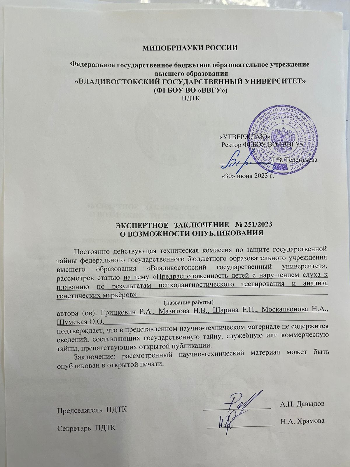 Предрасположенность детей с нарушением слуха к плаванию по результатам психодиагностического тестирования и анализа генетических маркёров