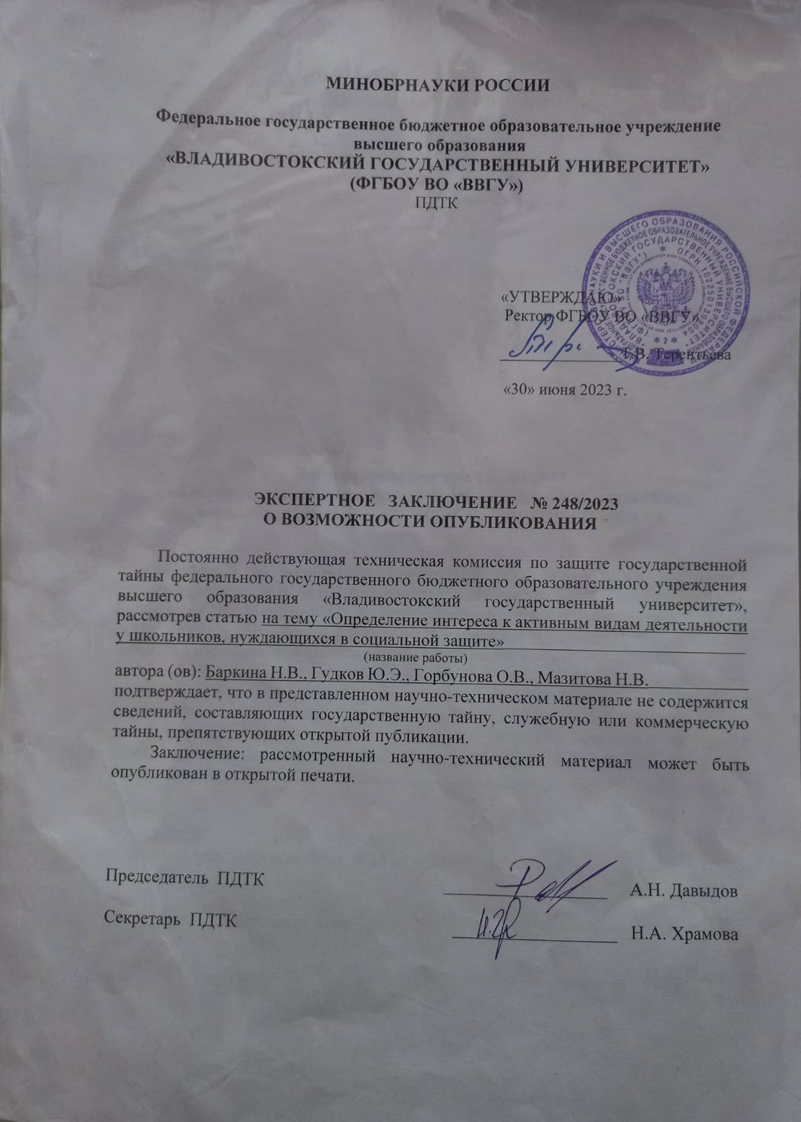 Определение интереса к активным видам деятельности у школьников, нуждающихся в социальной защите.