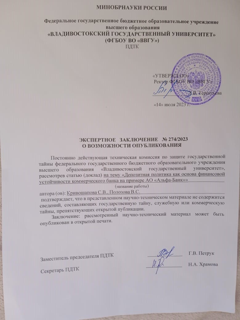 ДЕПОЗИТНАЯ ПОЛИТИКА КАК ОСНОВА ФИНАНСОВОЙ УСТОЙЧИВОСТИ КОММЕРЧЕСКОГО БАНКА НА ПРИМЕРЕ АО "АЛЬФА-БАНК", Г. ВЛАДИВОСТОК