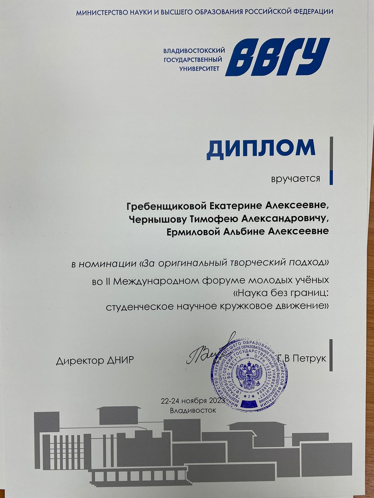 Международный Форум молодых ученых «Наука без границ: студенческое научное кружковое движение»: сборник статей. - Владивосток, 22-25 ноября 2023 г. – Владивосток, ВВГУ