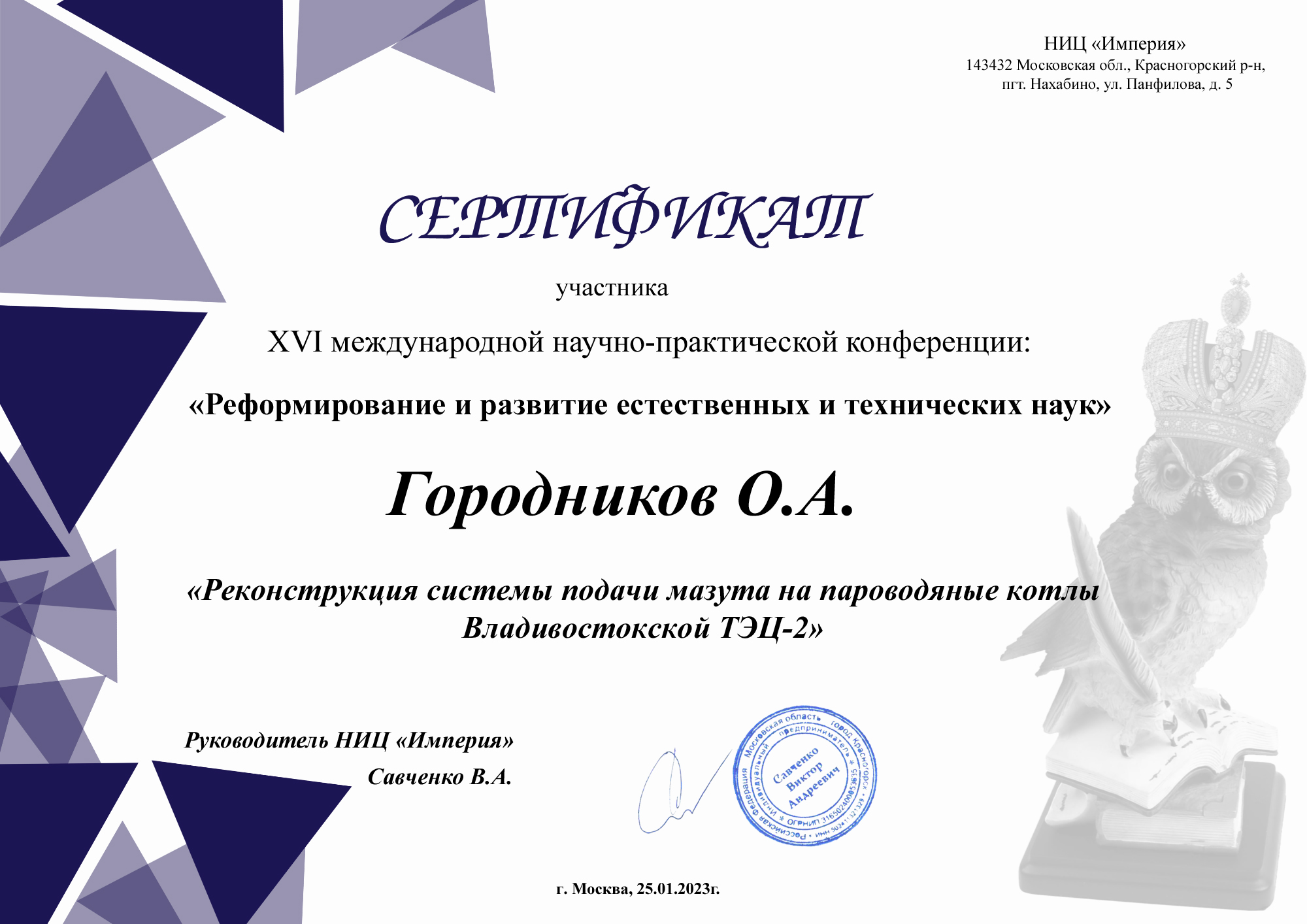 РЕКОНСТРУКЦИЯ СИСТЕМЫ ПОДАЧИ МАЗУТА НА ПАРОВОДЯНЫЕ КОТЛЫ ВЛАДИВОСТОКСКОЙ ТЭЦ-2