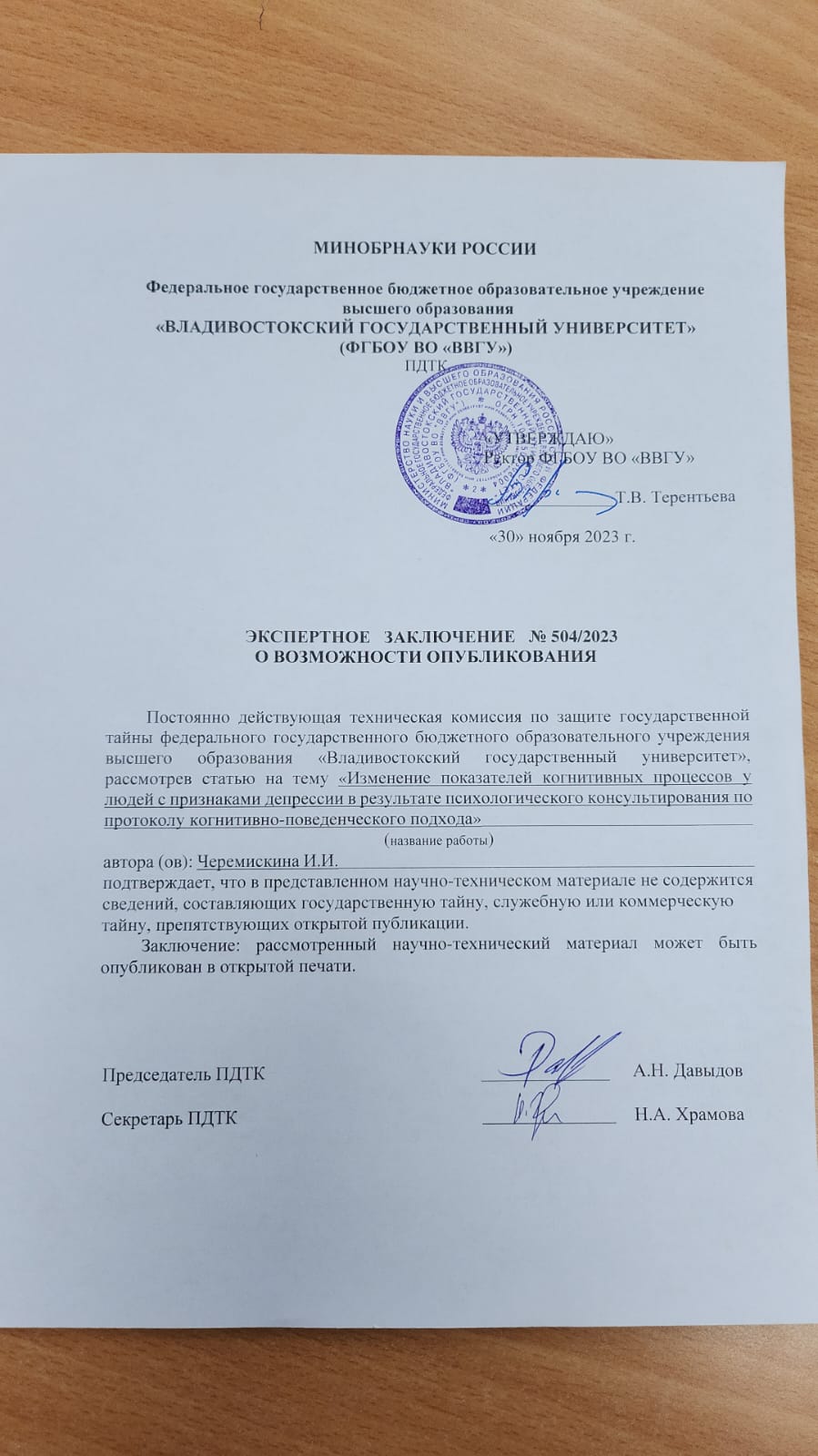 Изменение показателей когнитивных процессов у людей с признаками депрессии в результате психологического консультирования по протоколу когнитивно-поведенческого подхода