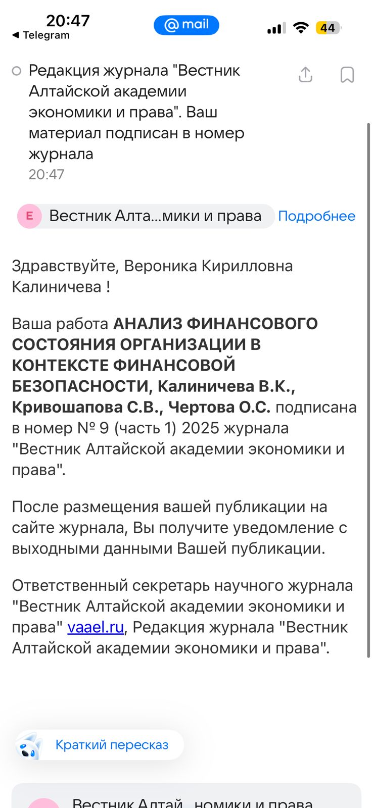 АНАЛИЗ ФИНАНСОВОГО СОСТОЯНИЯ ОРГАНИЗАЦИИ В КОНТЕКСТЕ ФИНАНСОВОЙ БЕЗОПАСНОСТИ