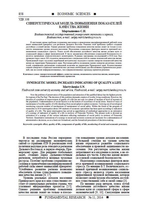 Синергетическая модель повышения эффективности показателей качества жизни