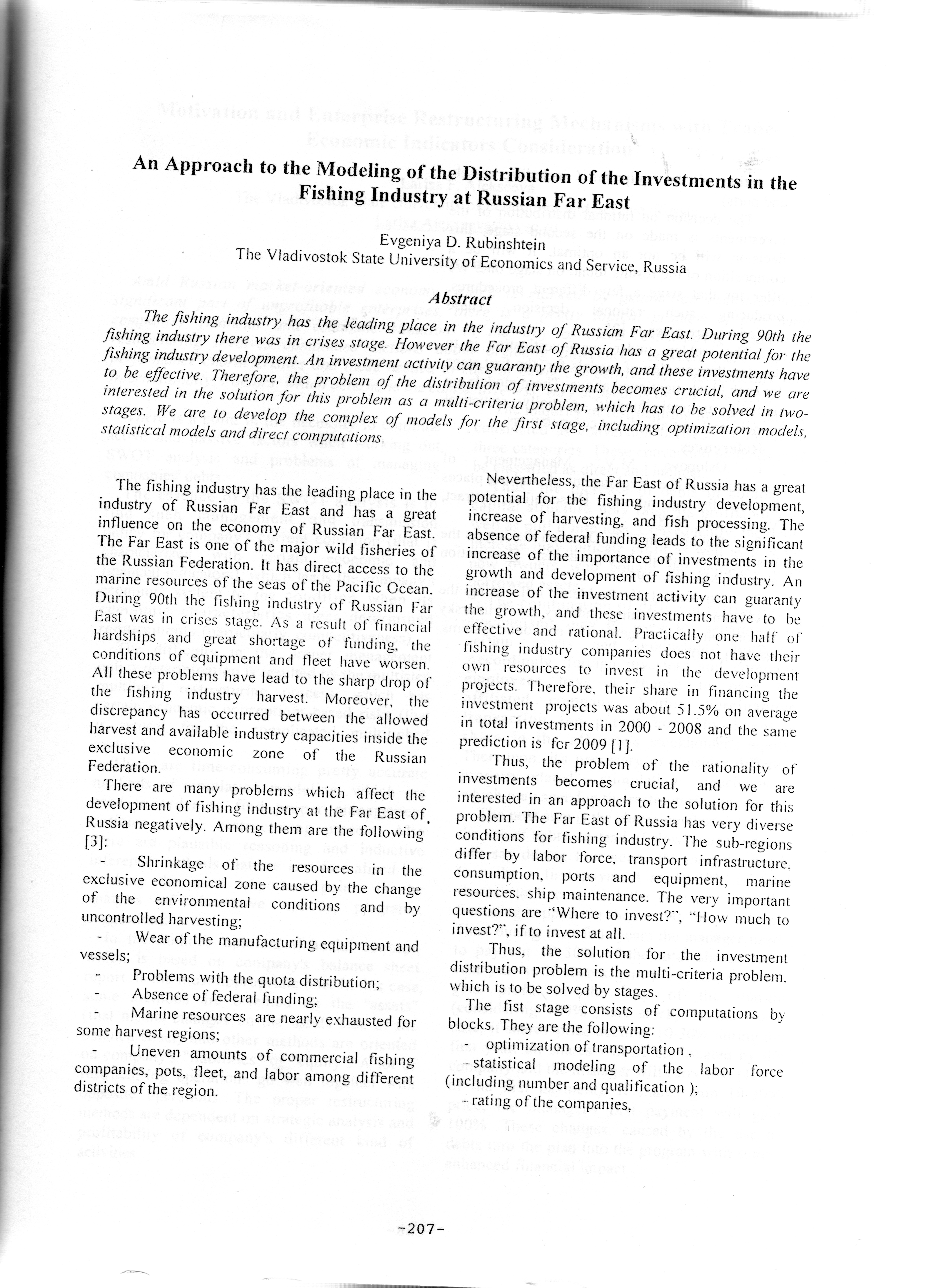 An approach to the Modeling of the distribution of the investments in the fishing industry at Russian Far East