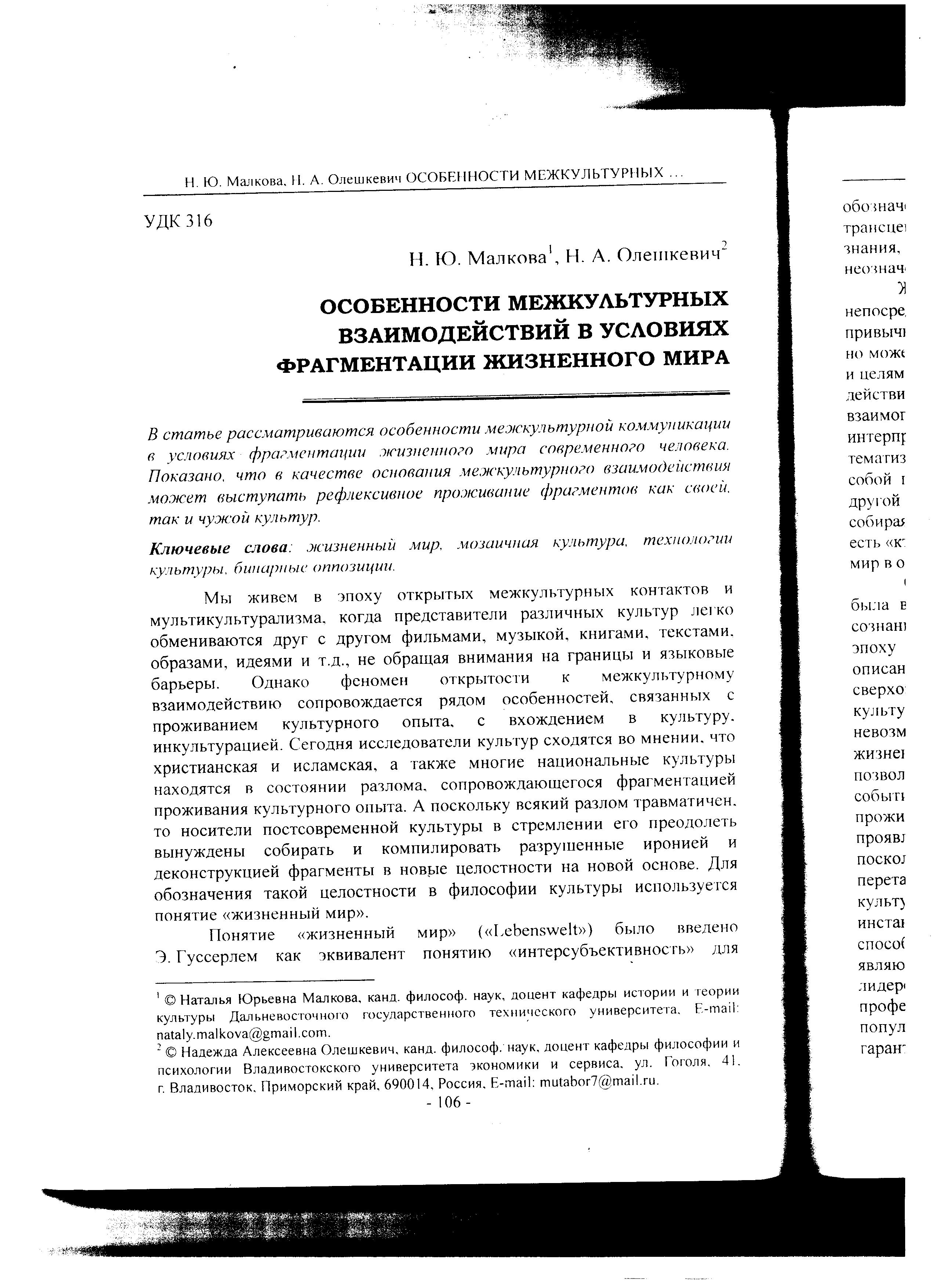 Особенности межкультурных взаимодействий в условиях фрагментации жизненного мира